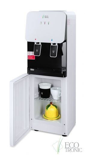 Компактный кулер для воды с функциями нагрева и охлаждения. С небольшим шкафчиком в нижней части. Электронное охлаждение. Корпус белого цвета с черной вставкой в области кранов подачи воды. Индикация режимов нагрева, охлаждения и готовности воды. Краны «нажим кружкой».