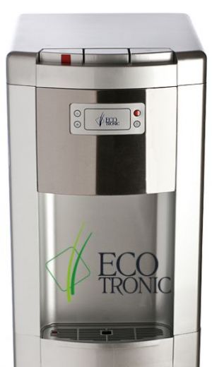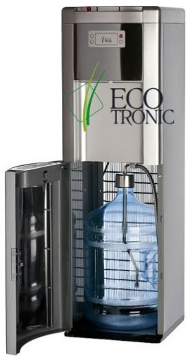 Ecotronic P9-LX Silver - кулер с нижней загрузкой бутыли. Специальная изогнутая, регулируемая по длине заборная трубка позволяет производить забор воды из бутыли без остатка. Три крана подачи воды: горячая, прохладная и холодная. Горячий кран с защитой от случайного нажатия (защита от детей). Лоток со встроенным поплавком, сигнализирующим о заполнении. Закачка воды в систему кулера происходит с помощью водной помпы. Выкатная полка отсутствует.