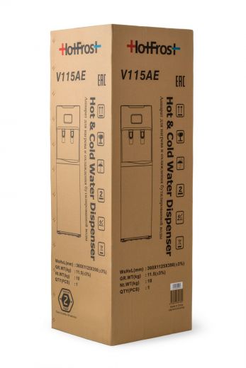 Кулер для воды HotFrost V115AE представлен на официальном сайте кулеров для воды ХотФрост в России, в разделе напольные кулеры. Также данный кулер имеет следующие особенности: электронное охлаждение, нижнюю загрузку бутыли.