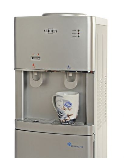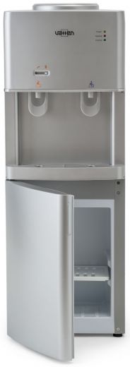 Изящный компактный кулер с холодильником. Цвет корпуса "серебро". Бутылеприёмник, а также передняя и верхняя панели изготовлены из высококачественного пластика, хромированный молдинг, боковые панели металлические. Два крана "пуш", т.е. нажим кружкой. Кран горячей воды имеет отключаемую "защиту от детей". Встроенная холодильная камера объёмом 10 л., с извлекаемой полкой. Баки горячей и холодной воды из нержавеющей стали. Три LED индикатора (включение питания, индикатор нагрева, индикатор охлаждения). Пригоден для эксплуатации в очень жарком климате - температура эксплуатации кулера от 10 до 38 градусов Цельсия.