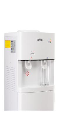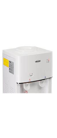 Изящный компактный кулер со шкафчиком. Цвет корпуса белый. Бутылеприёмник, а также передняя и верхняя панели изготовлены из высококачественного, устойчивого к ультрафиолету ABS пластика, хромированный молдинг, боковые панели металлические. Два крана "пуш", т.е. нажим кружкой. Кран горячей воды имеет отключаемую "защиту от детей". Встроенный шкафчик для хранения объёмом 10 л., с извлекаемой полкой. Баки горячей и холодной воды из нержавеющей стали. Три LED индикатора (включение питания, индикатор нагрева, индикатор охлаждения). Пригоден для эксплуатации в очень жарком климате - температура эксплуатации кулера от 10 до 38 градусов Цельсия.