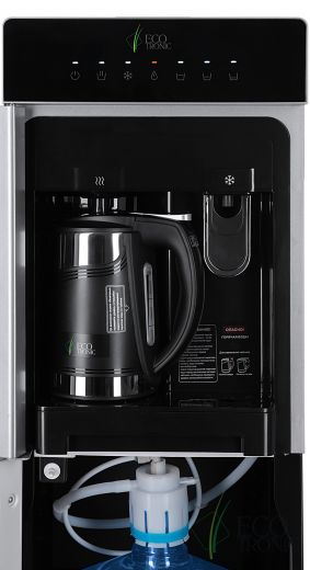 Кулер Ecotronic M15-LXKEM с ЧАЙНИКОМ! Аппарат с нижней загрузкой бутыли, электронное охлаждение. Цвет корпуса: черный с серебряной вставкой. Особенность аппарата, встроенный литровый чайник! Горячая вода нагревается в чайнике,а объем наливаемой воды, регулируется кнопками на передней панели. Разливать горячую воду, так же можно только из чайника! Холодная вода набирается из крана (кран – нажим кружкой). Преимуществом аппарата, является высокая производительность нагрева горячей воды, до 9 литров в час! Температура нагрева воды достигает 99С! Панель управления с возможностью отключения нагрева и/или охлаждения воды. Индикация режимов нагрева/охлаждения и отсутствия воды в бутыли. Тихая работа водяного насоса. Защита от протечек. В боковых панелях имеются отверстия под крепления держателей для стаканов.