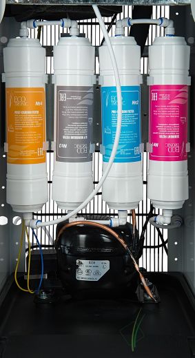 Пурифайер напольного типа с 4-х ступенчатой UF фильтрацией воды. С увеличенным баком горячей воды 3,9 л. Единовременно можно получить 2,5 л воды температурой 90-94С, затем около 20 минут происходит нагрев.