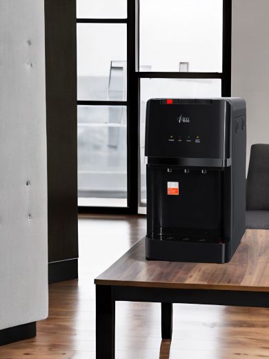 Электронное охлаждение. Стильный дизайн. Три крана типа "клавиши": подачи горячей воды с защитой от детей, холодной воды и подачи воды комнатной температуры из бутыли. Индикация работы пурифайера, нагрева и охлаждения воды. Корпус черного цвета с серебристым декором.