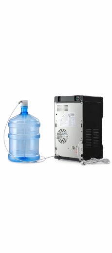 Бутыль с водой подключается к кулеру через гибкую трубку и может быть установлена в удобном месте, на расстоянии до 3 метров от кулера. Подача воды из бутыли осуществляется при помощи встроенного в кулер насоса (как у кулера с нижней загрузкой бутыли) и её не нужно поднимать на кулер. При этом, бутыль может быть спрятана в шкафу, в кухонном столе, или под столом и не находиться на виду, внося диссонанс в интерьер.